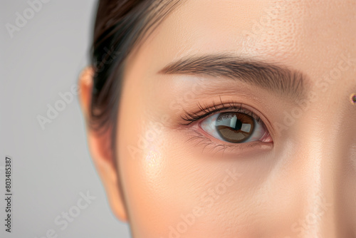 Cropped beautiful female Asian beauty care models face front close up. Calm relaxed young Korean woman with soft clean perfect skin looking at camera.