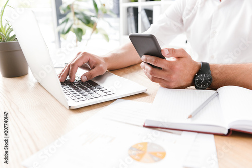 Cropped image of businesslike man in white shirt sitting at table and using smartphone with silver laptop, while working in bright office room