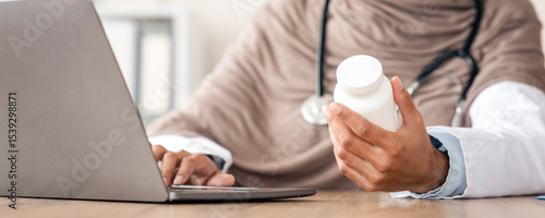 Cropped of female doctor young woman in hijab holding jar with medicine supplements or vitamins and using laptop, unrecognizable muslim lady physician working online from office in clinic, copy space