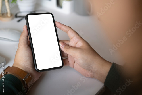 Cropped shot businessman using smart phone while sitting at his workplace..