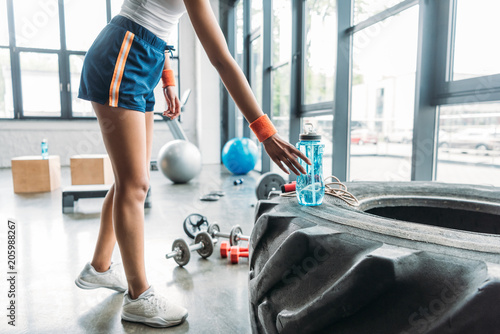 cropped shot of female athlete picking up bottle of water from training tire at gym