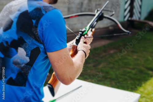 Crossbow shooting and archery at the shooting range, women and men practicing with arbalest at shooting gallery, compound bow training, aiming the target with arbalest at archery range, bow and arrows