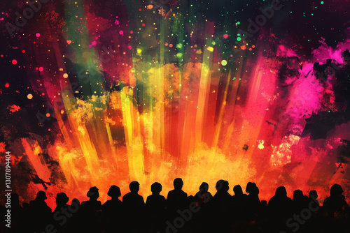 Crowd watching stunning light show with colorful explosions and particles