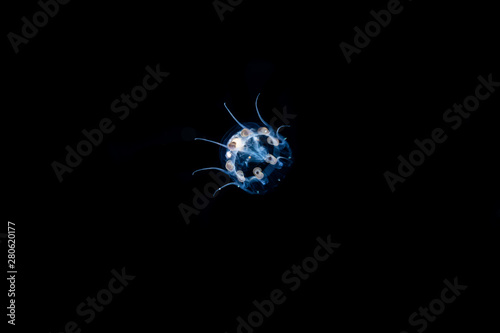 Crown jellyfish, Nausithoe punctata, Tiny, discoid, thick, with finely warted surface and crenate coronal groove. Disc flat, diameter recorded to ca. 15 mm
