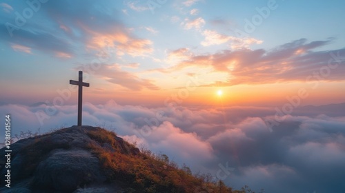 Crucifix stands on peak. Sun sets over clouds. Religious symbol against beautiful sky. Christianity concept. Worship and faith backdrop. Spiritual landscape at dawn.