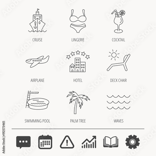 Cruise, waves and cocktail icons. Hotel sign.