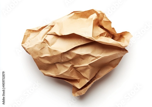 Crumpled brown paper parcel on white background. Detailed view of paper's texture and folds