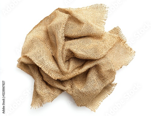 Crumpled burlap fabric with frayed edges isolated on white background.