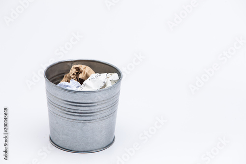 Crumpled business papers with metal pot concept view on white