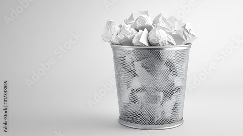 Crumpled Paper Waste in Metallic Trash Bin on White Background