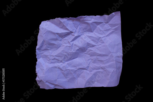 Crumpled purple paper piece isolated on a black background. Wrinkled paper sheet.