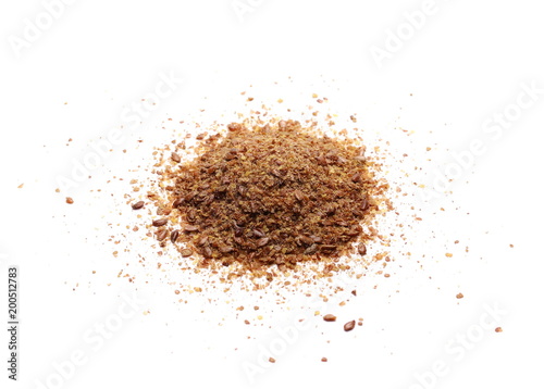 Crushed, milled flax, linen seeds isolated on white background, top view