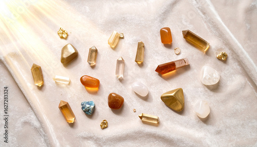 Crystal Collection: An assortment of radiant crystals and gemstones arranged artfully, reflecting light and exhibiting a spectrum of colors, evoke a sense of wonder and beauty.
