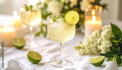 Crystal Glass of Sparkling Elderflower Mocktail with Lime and Mint – Ultra Detailed 8K Photorealistic Drink Photography