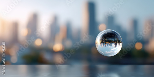 Crystal sphere reflecting blurred city skyline at sunset, serene mood
