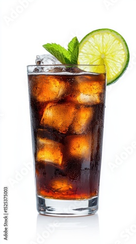 Cuba Libre cocktail, filled with ice cubes, dark rum and cola, garnished with a fresh lime wedge on the rim and a mint leaf.