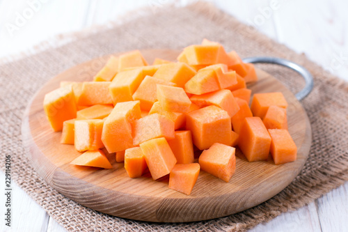 Cubes of pumpkin on cutting board