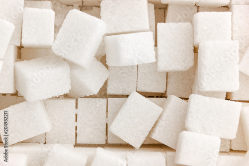Cubes of sugar on a white background. Many cubes of sugar close-up.