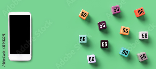 cubes with 5G symbols symbolizing connected network nodes and a smartphone on colorful background