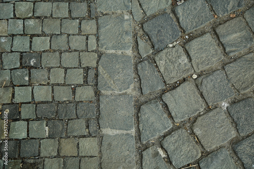 Cubic stone, cobblestone tile pavement. Abstract and decorative sidewalk top view.