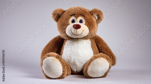 Cuddly brown stuffed bear toy sits against a soft gray background