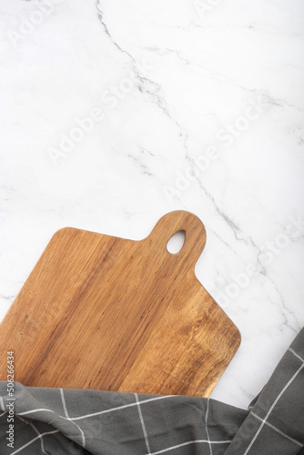 culinary background with wooden cutting board and towel on granite table