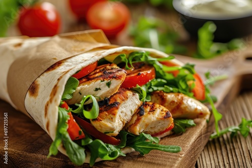 Culinary Bliss in a Wrap: Grilled Chicken Wrapped in a Soft Tortilla with Fresh Vegetables - A Healthy and Flavorful Meal Offering a Perfect Blend of Savory Goodness and Crunch.