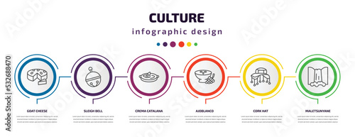 culture infographic template with icons and 6 step or option. culture icons such as goat cheese, sleigh bell, crema catalana, ajoblanco, cork hat, maletsunyane vector. can be used for banner, info