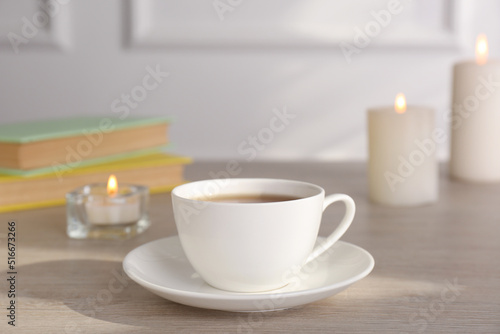 Cup of aromatic coffee and burning candles on wooden table indoors