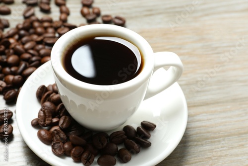 Cup of coffee and coffee beans on wooden background