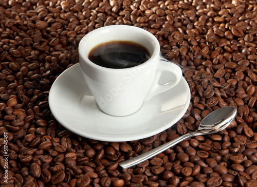Cup of coffee on coffee beans background