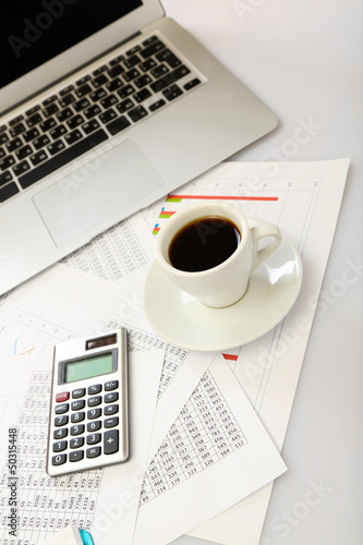 Cup of coffee on office desktop close-up