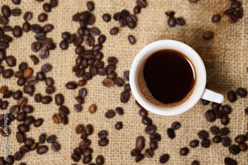 Cup of coffee on sackcloth with coffee beans