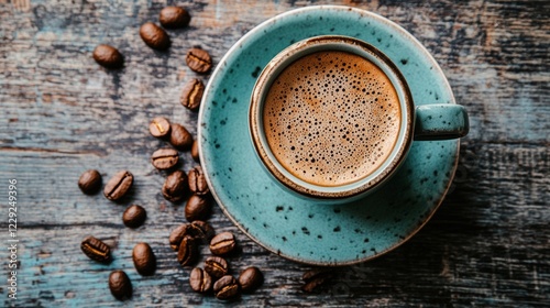 Cup of coffee with beans on a rustic wooden table