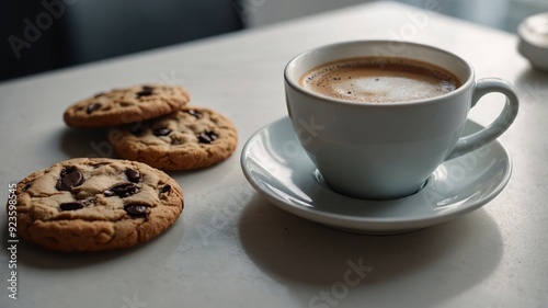 cup of coffee with cookies on a white table.