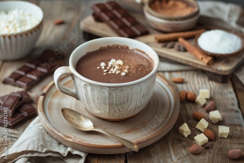 Cup of fresh homemade hot chocolate with ingredients on the kitchen bench. Front view.