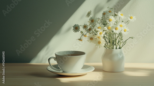 Cup of tea with a vase of chamomile flowers on a wooden table in soft natural light