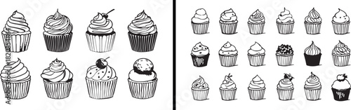 Cupcake Illustration Art, Dessert Line Drawing, Hand Drawn Cupcake Vector, Sweet Food Artwork, Minimal Bakery Design, Black and White Dessert Art, Creative Cupcake Illustration, Elegant Cake Design, M