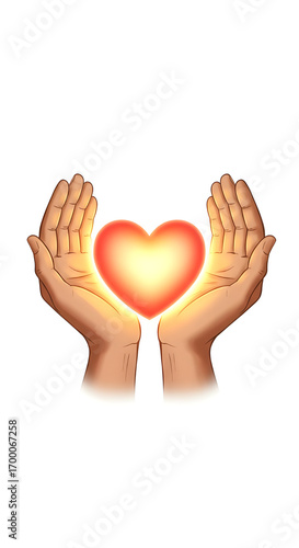 Cupped hands gently cradle a glowing heart radiating warmth and love, perfect for Valentine's Day cards