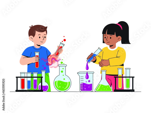 Curiosity in the Lab: Young scientists engage in a vibrant science experiment, engrossed in the world of colors and chemical reactions.