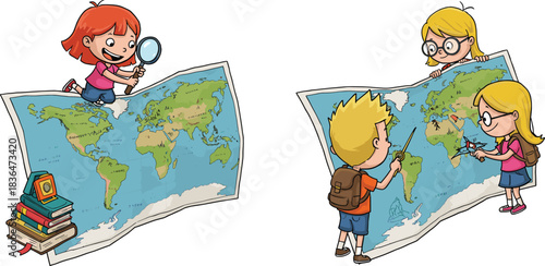 Curious children studying world map, exploration, discovery, geography, travel, learning, education, knowledge.