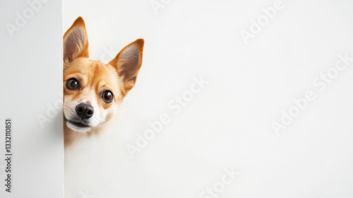 Curious corgi peeks around the corner in a cozy home setting