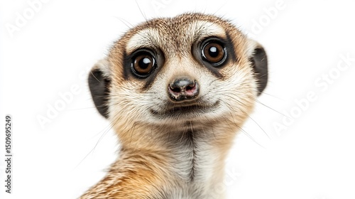 Curious meerkat tilting its head detailed fur texture and expressive eyes isolated on a white background