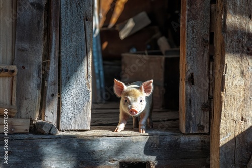 Curious piglet exploring a wooden farm structure rural setting animal photography natural light ground-level perspective