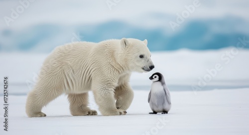 Curious Polar Bear Cub Investigates a Lost Penguin Chick on Arctic Ice
