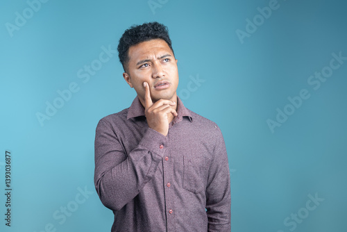 Curious young man in a maroon shirt pointing upward with his index finger, looking up with questioning expression. Studio portrait on blue background. Idea, solution, or asking a question concept.