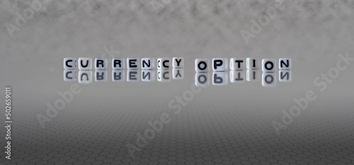 currency option word or concept represented by black and white letter cubes on a grey horizon background stretching to infinity