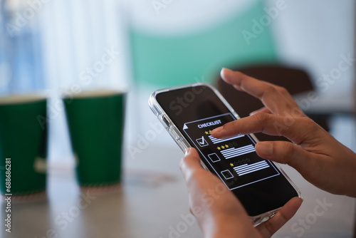 Customer feedback online concept, people check and correct mark on quality check list on application, Check list online.