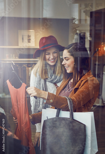 Customer, happy and shopping in boutique by women with dress for promotion, sale and discount. Smile, friends and people checking rack of clothes in fabric, material and retail store at indoor mall