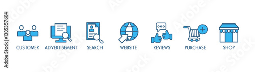 CUSTOMER JOURNEY banner web icon vector illustration concept of customer buying decision process with icon of customer, advertisement, search, website, reviews, purchase and shop